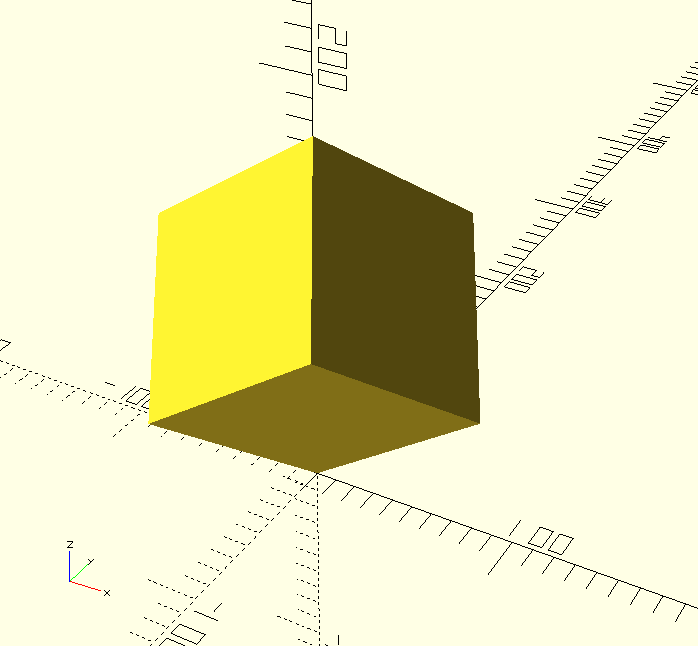 5. Ein einfacher Würfel mit Kantenlänge 100, dieser soll aber, ähnlich wie die Doppelpyramide in der vorigen Aufgabe, so gekippt werden, dass die Z-Achse durch die zwei am weitesten entfernten Eckpunkte geht!